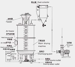 La placa de prensado continuo alimenta el material a la capa superior de secado, donde la mezcla es agitada por los rastrillos del brazo giratorio y se aplica calor. El material fluye a través de la superficie de la placa de secado a lo largo de la estructura helicoidal. El material es llevado al borde exterior de la placa y a continuación se despliega sobre la placa de secado. Posteriormente, se mueve hacia el interior y cae por el agujero central en la siguiente capa. Las placas alternan entre grandes y pequeñas a medida que el material cae, lo que permite la mezcla adecuada del material mientras se seca. El producto secado es finalmente descargado desde la placa inferior en el puerto de descarga.