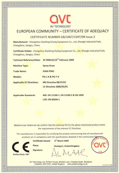 在经过技术文件检查、型式测试、质量保证,以及在实践中由生产者或第三方机构评估等必经评估模块后,常州先锋贝斯特干燥工程有限公司的Spay Dryer(离心喷雾干燥机、压力喷雾干燥机)已于2009年3月6日正式获得CE^许可,今后凡进军欧盟市场,CE标志将成为合法外衣。