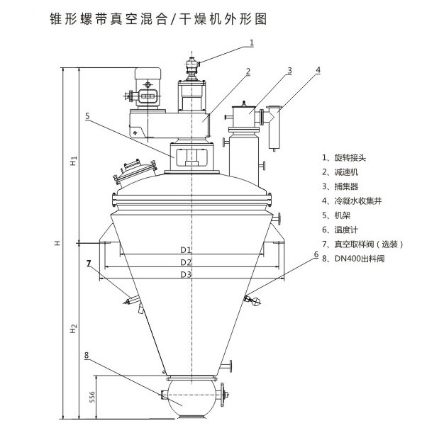 锥形螺带真空混合/干燥机是集混合、干燥及蒸馏为一体的多功能设备,采用全密闭GMP清洁设计,它的干燥效率较高。螺带搅拌器可使物料实现自下而上螺旋循环的搅拌效果,能得到高效的传热特性,物料装填率在30%-^情况下工作,可得到全部加热面积的利用效率。它是节能、高效、环保清洁的新型干燥设备。