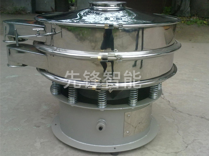 本机由料斗、振荡室、联轴器、电机组成。振荡室内有偏心轮、橡胶软垫、主轴、轴承等组成.可调节的偏心重锤经马达驱动传达到主轴中心线,在平衡状态下,产生离心力,使物料强度改变在筛内形成轨道旋涡。重锤调节器的振幅大小可根据不同物料和筛网进行调整。