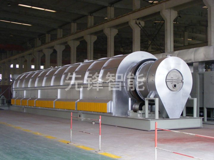 间接加热连续操作型焙烧炉工作时,物料经炉头喂料器进入炉筒,加热炉膛内装有电热元件或燃料燃烧器,通过自动控制系统调节电热元件的电流或燃烧器的火焰来控制炉膛温度,从而使物料在一定温度下进行焙烧。炉筒操作时水平或倾斜。物料在炉筒内一边焙烧,一边在炉筒转动下向前移动,焙烧后的物料从出料端进入下一道工序。物料的焙烧时间可通过调节炉筒转速或炉筒与水平的夹角来控制。